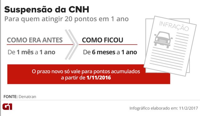 O tempo mínimo de suspensão para quem atingiu 20 pontos ou mais na Carteira Nacional de Habilitação (CNH) dentro de 1 ano aumentou em novembro passado. Foi de 1 mês para 6 meses.
